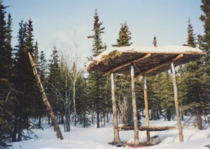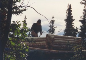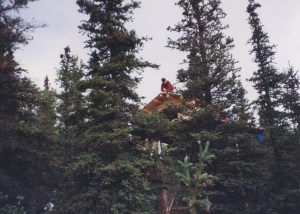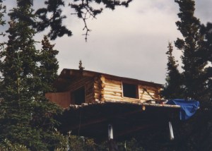 My plans for building in the foothills of the Alaska Range had seemed crazily ambitious as I sat on the tarmac at the Fairbanks airport. I felt overly citified and out of place in my California clothes among the rough wool shirts and heavy pants of the “real Alaskans” around me. What was I thinking? How would I survive for more than a month in this demanding country? We were brazenly embarking on a project that would span many years and hold challenges that I could only begin to guess at. Our first plan was to build the cache, a traditional log building high in the air on stilts where we could store our food and tools during the months we would be absent. Without a cache, any materials left on the ground would be ready fodder for bears, wolves and other denizens of the land. After building the cache, we could begin to cut trees in earnest for the construction of the cabin.